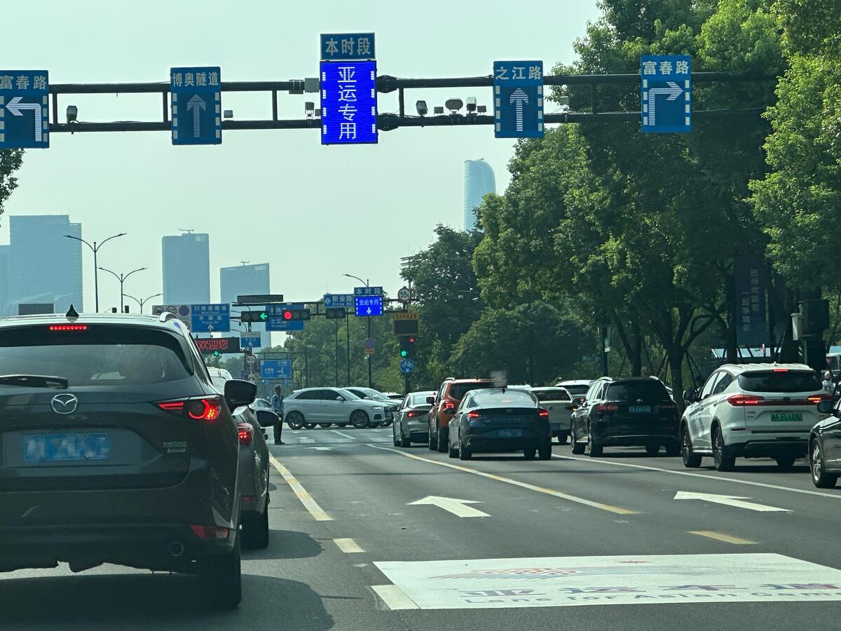 8时50分左右,车流逐渐增大,在闻涛路与复兴大桥交叉口附近,因车道上方电子屏显示“亚运专用”,此处短时出现了车辆拥堵情况。待亚运演练车辆驶过后几分钟,电子屏实时显示变更为“社会车辆允许借用亚运车道”。