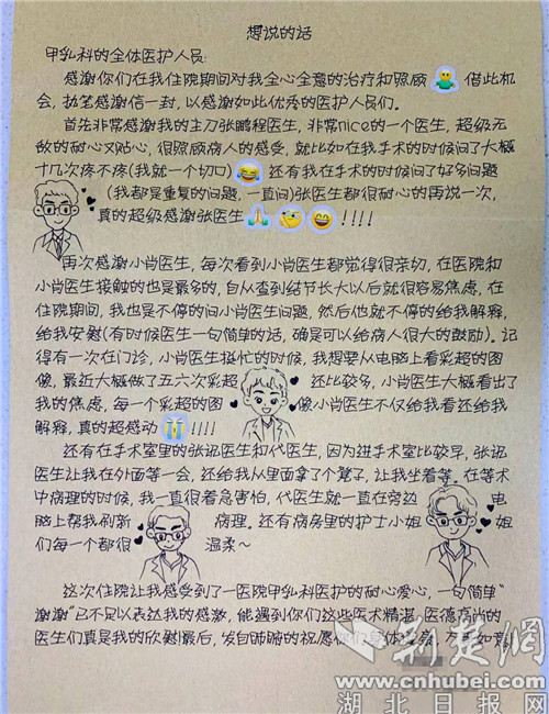 小吕在感谢信中写道:“这次住院让我感受到了一医院甲乳科医护的耐心和爱心,一句简单‘谢谢’已不足以表达我的感谢,能遇到你们这些医术精湛,医德高尚的医生们真是我的欣慰!”