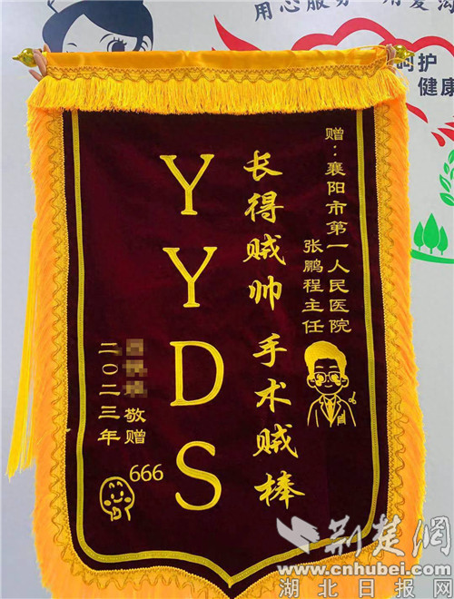 荆楚网(湖北日报网)讯(通讯员 马珊珊、宁婧)8月20日,在襄阳市第一人民医院甲乳肿瘤科,患者小吕将一面印有“长得贼帅 手术贼棒 YYDS”的锦旗和一封手写感谢信,送到了医护人员手中。