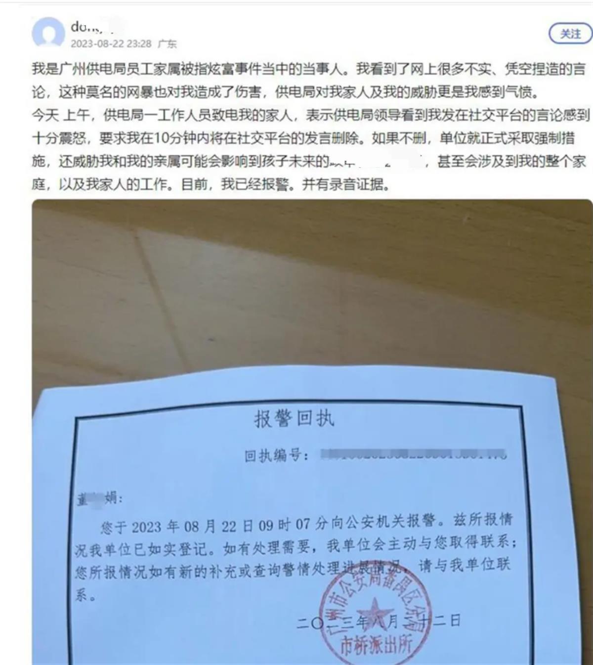 然而,现在又节外生枝,自称董某娟的网友称自己受到了威胁,广州供电局一工作人员致电她的家人,要求她在10分钟内将社交平台上的发言删除。如果不删,单位将采取强制措施,并威胁称会影响孩子未来和她的工作。