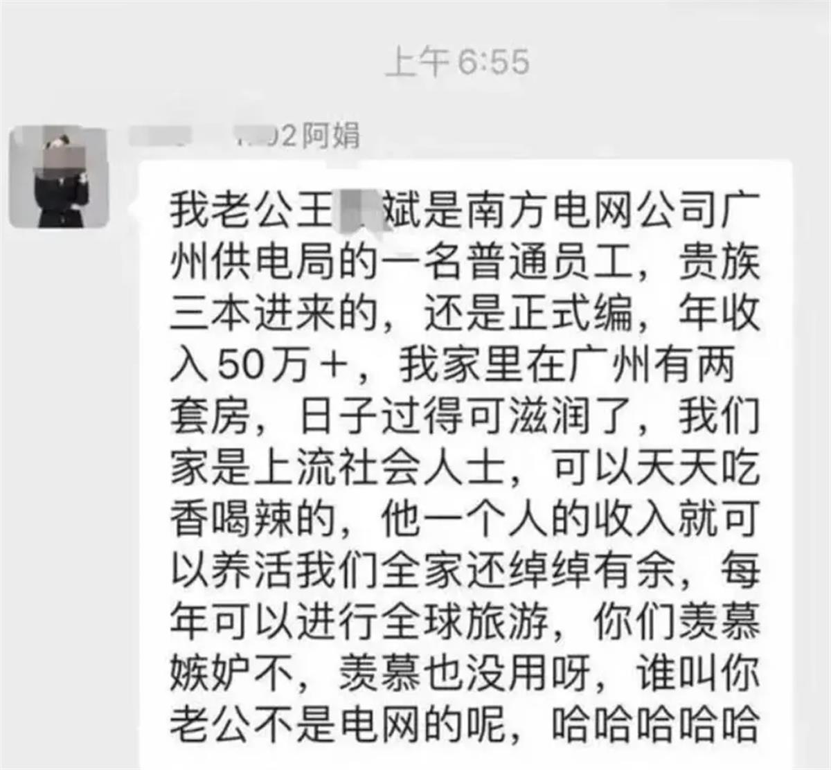 8月22日,多张网络流传的截图直指南方电网广州供电局员工王某斌。截图显示,董某娟在一业主群内高调炫富,称丈夫一个三本毕业生年收入50多万元,在广州有两套房等。自称董某娟的网友还称,当年王某斌为了入职广州供电局,花费了30万元行贿,其中25万元给了时任广州供电局局长,5万元给了中间人。
