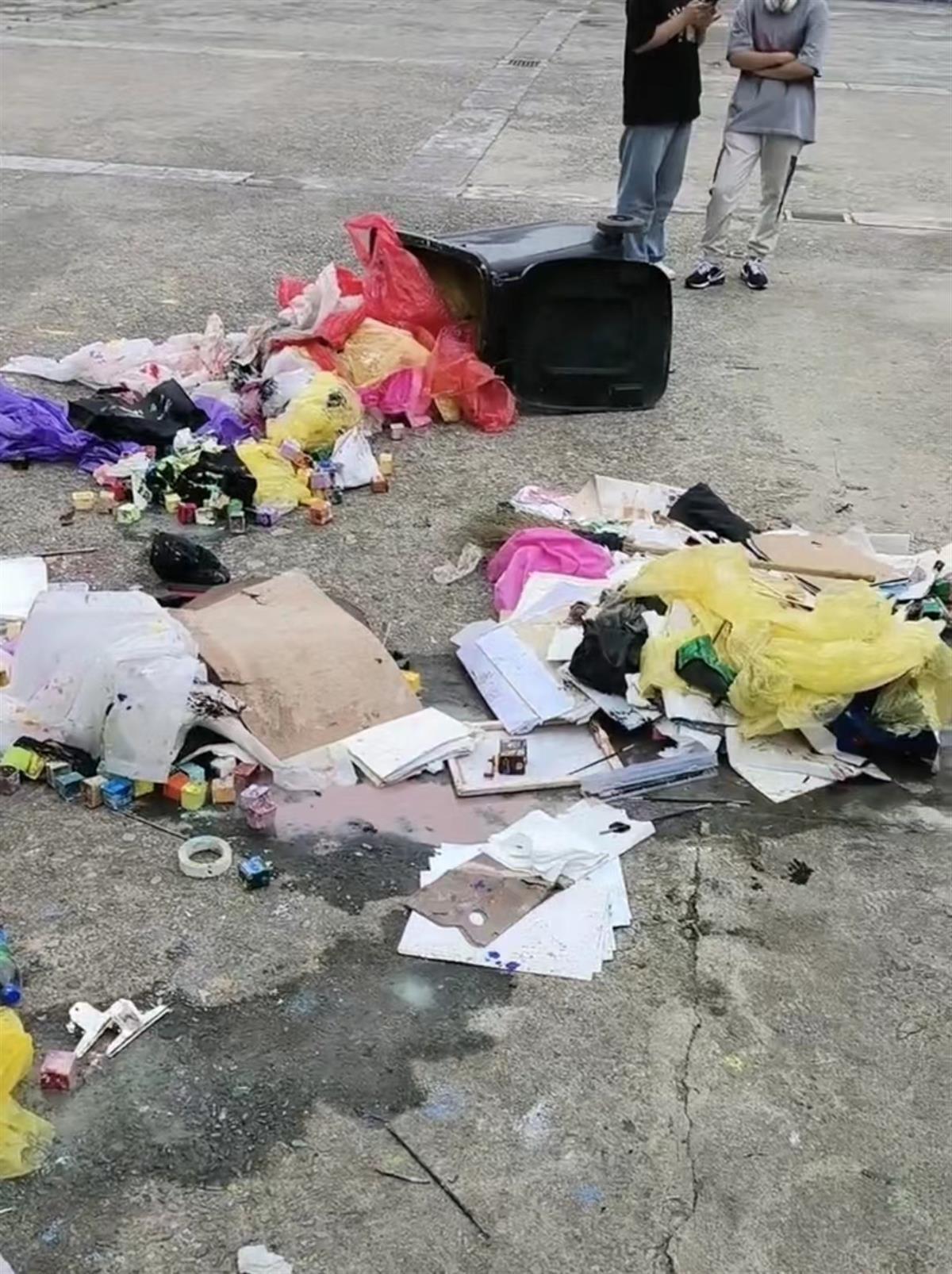 另有学生表示,此前没有接到任何要求收拾画具的通知。还有学生表示,被扔在地上的有画板、画包、画架等物品,一套画具价值数百元,另外还有一些个人的画作被扔进了垃圾桶。
