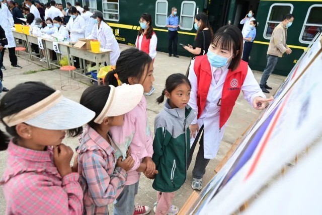 8月21日下午14时,由中囯铁路成都局集团有限公司联合多家医院开行的健康列车驶进凉山彝族自治州喜德县尼波镇。