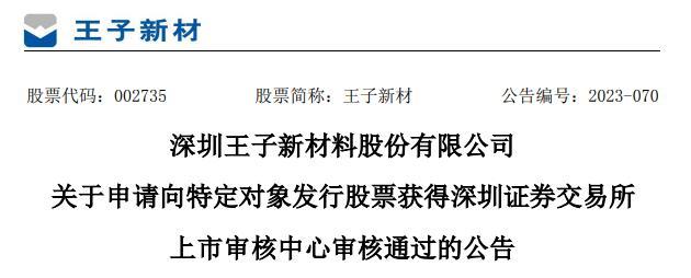 中国经济网北京8月24日讯 昨晚,王子新材(002735.SZ)发布公告称,公司于2023年8月23日收到深交所上市审核中心出具的《关于深圳王子新材料股份有限公司申请向特定对象发行股票的审核中心意见告知函》,深交所发行上市审核机构对公司向特定对象发行股票的申请文件进行了审核,认为公司符合发行条件、上市条件和信息披露要求,后续深交所将按规定报中国证监会履行相关注册程序。