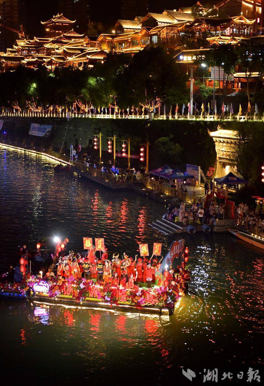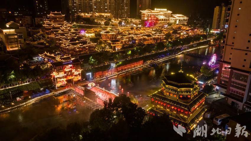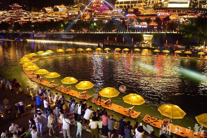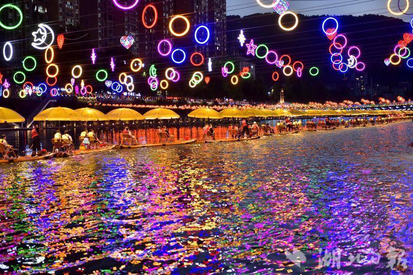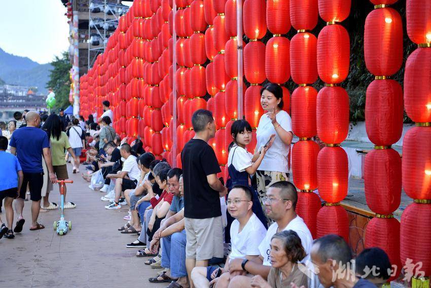 浪漫从墨达楼蔓延到整个城区。贡水河大桥为游客观赏而全面开放,河道两侧也被红色灯笼装点一新,而在水面上,一场盛大的土家婚礼正在进行,民俗表演轮番登场,一对新人在众人的祝福下拜堂结亲。