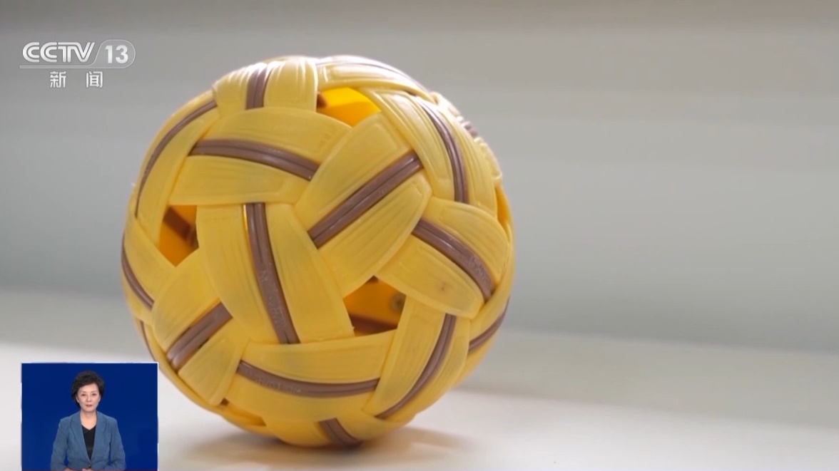 金华体育中心场馆群运行团队藤球项目竞赛副指挥长 袁华:藤球最初的确是藤蔓编制的,后来为了在正式比赛中使用,国际藤联和亚藤联对它的尺寸、大小和材质进行了规范,使器材能够符合它的技术特点,又保证藤球的传统性。现在我们的标准藤球是以塑料为骨架编制而成的。它和排球、足球最大的一个不同是在于它本身不充气,它的内部是镂空的,弹性来自本身塑料结构编织而成的弹性。