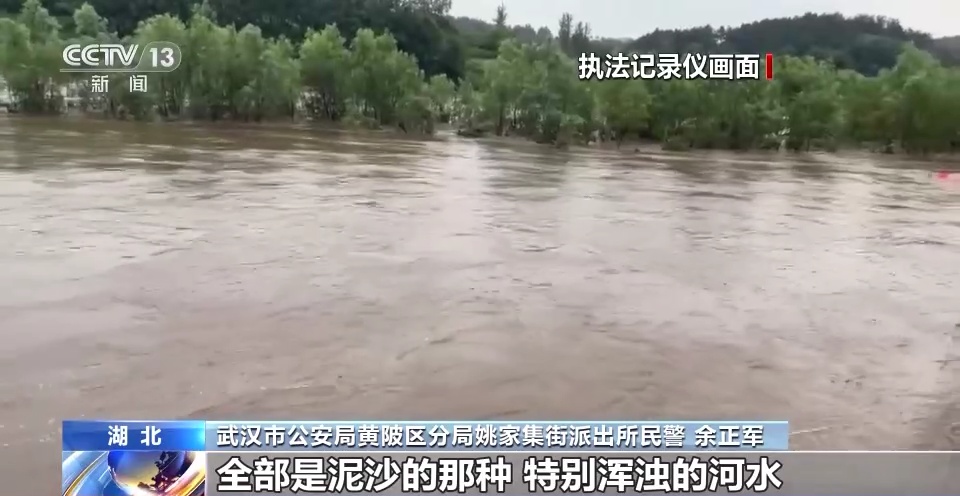 武汉市公安局姚家集街派出所民警 余正军:就是肉眼可见的速度涨,水流特别急,全部是泥沙的那种特别浑浊的河水,上面还夹杂的树等,都是冲下来的。