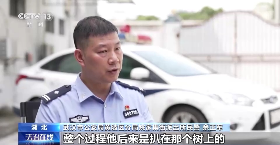 武汉市公安局姚家集街派出所民警 余正军:水位属于肉眼可见的速度在涨。我去的时候他脚能着地的,后来的时候水涨了,他就没办法,整个过程他后来是扒在那个树上的。