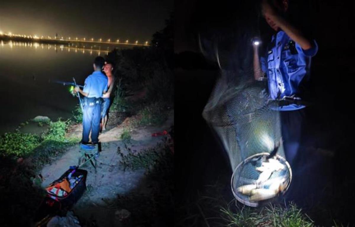 8月22日2时许,巡查至唐白河河岸,民警发现两名夜钓人员,通过检查渔具,发现朱某、窦某二人共使用5副鱼竿,且每支鱼竿有5只鱼钩,并无渔获。民警现场没收了违规渔具,并对二人进行批评教育。