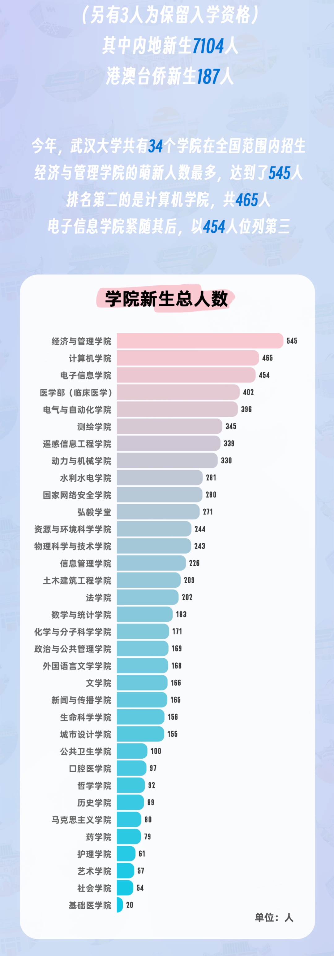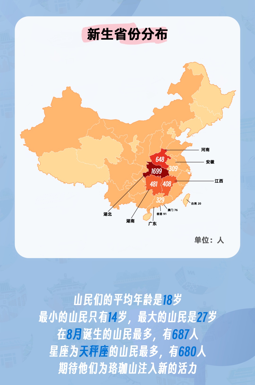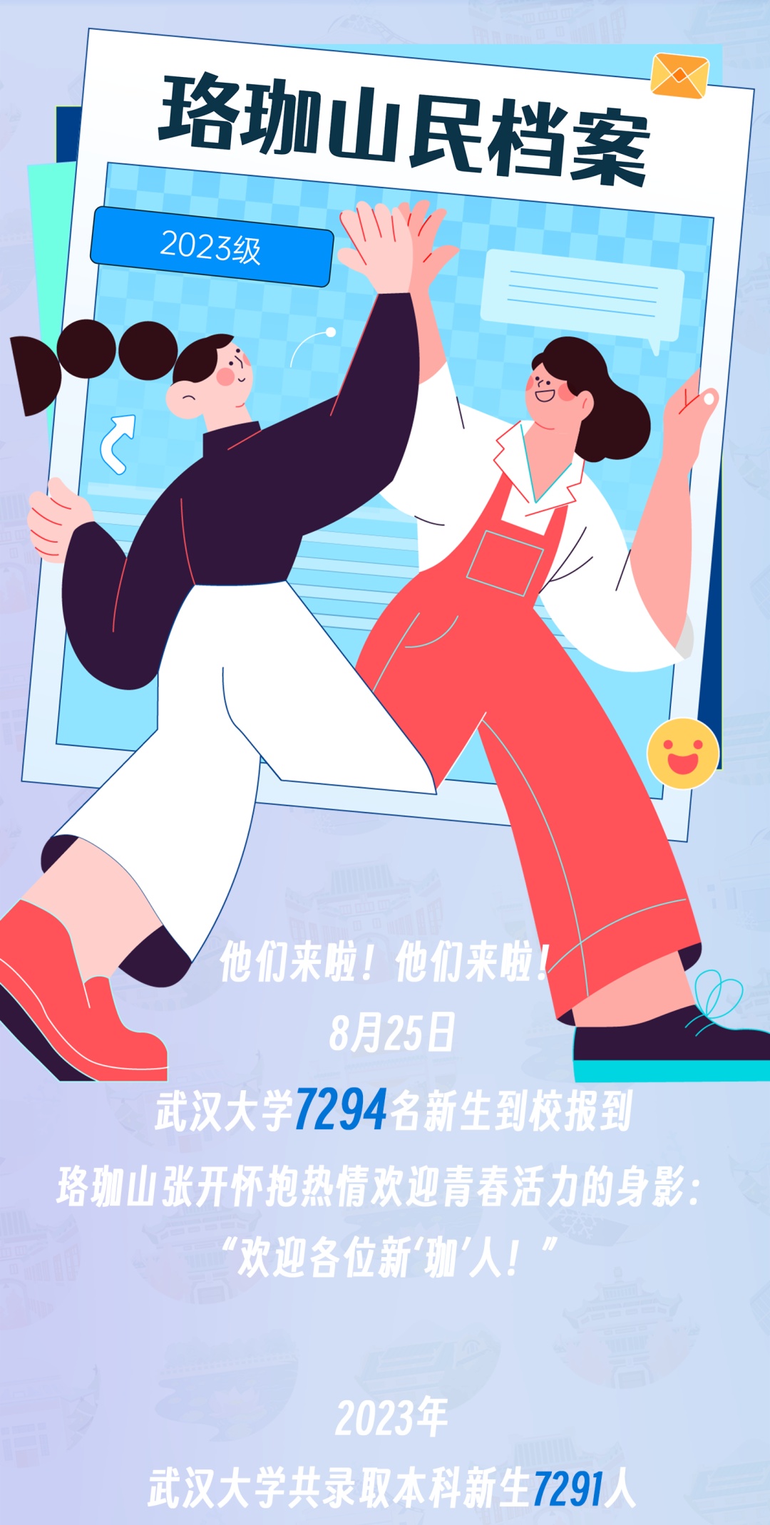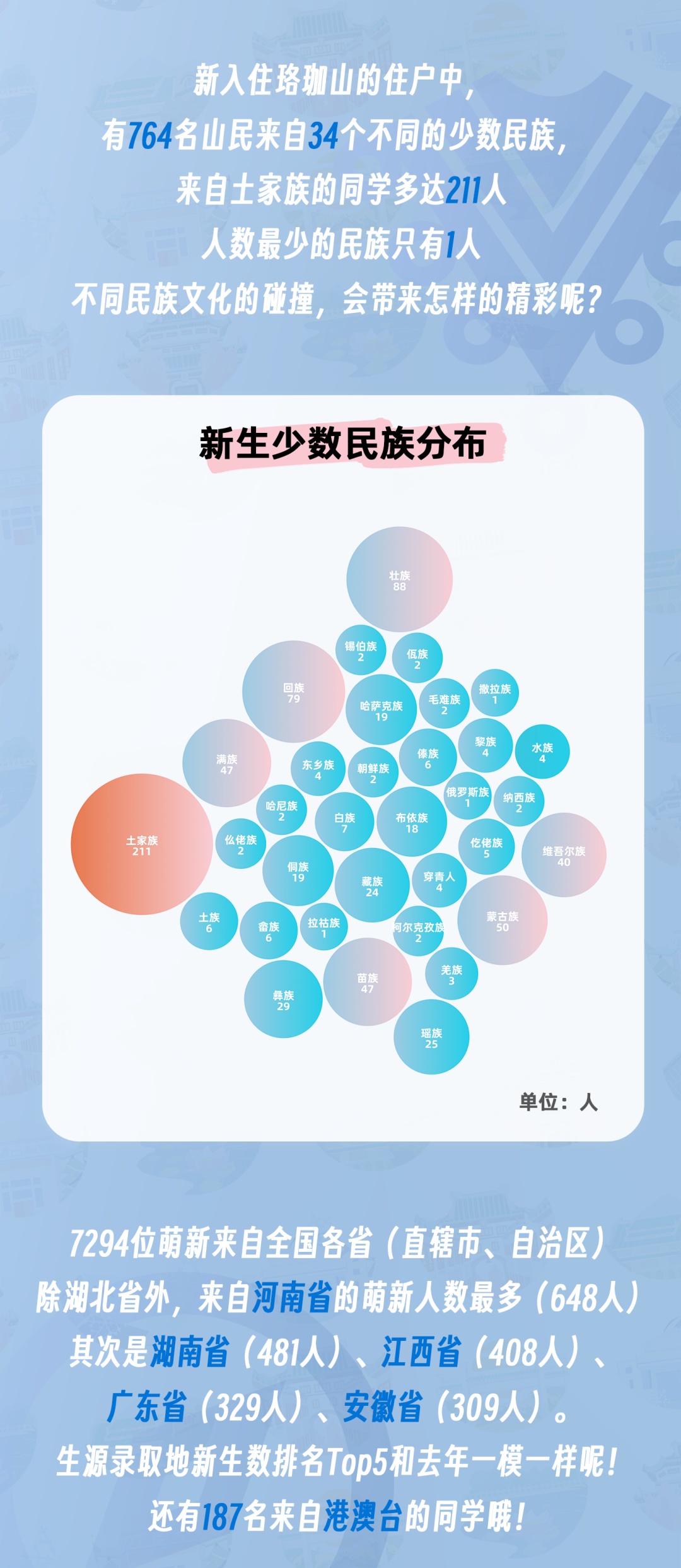 8月25日,武汉大学迎来7294名2023级本科新生到校报到。一张张朝气蓬勃的新面孔在校园涌动,来自五湖四海的有志青年相聚东湖之滨,即将开启曼妙人生的新画卷。珞珈山的新主人都来自哪里?哪个学院的“萌新”人数最多?迎新当日,武汉大学发布官方数据,用大数据详解“新武大人”。