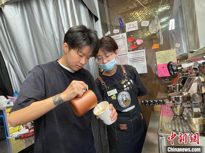 陈露蕾(左)与陈莹莹在制作咖啡。中新网记者 郑莹莹 摄