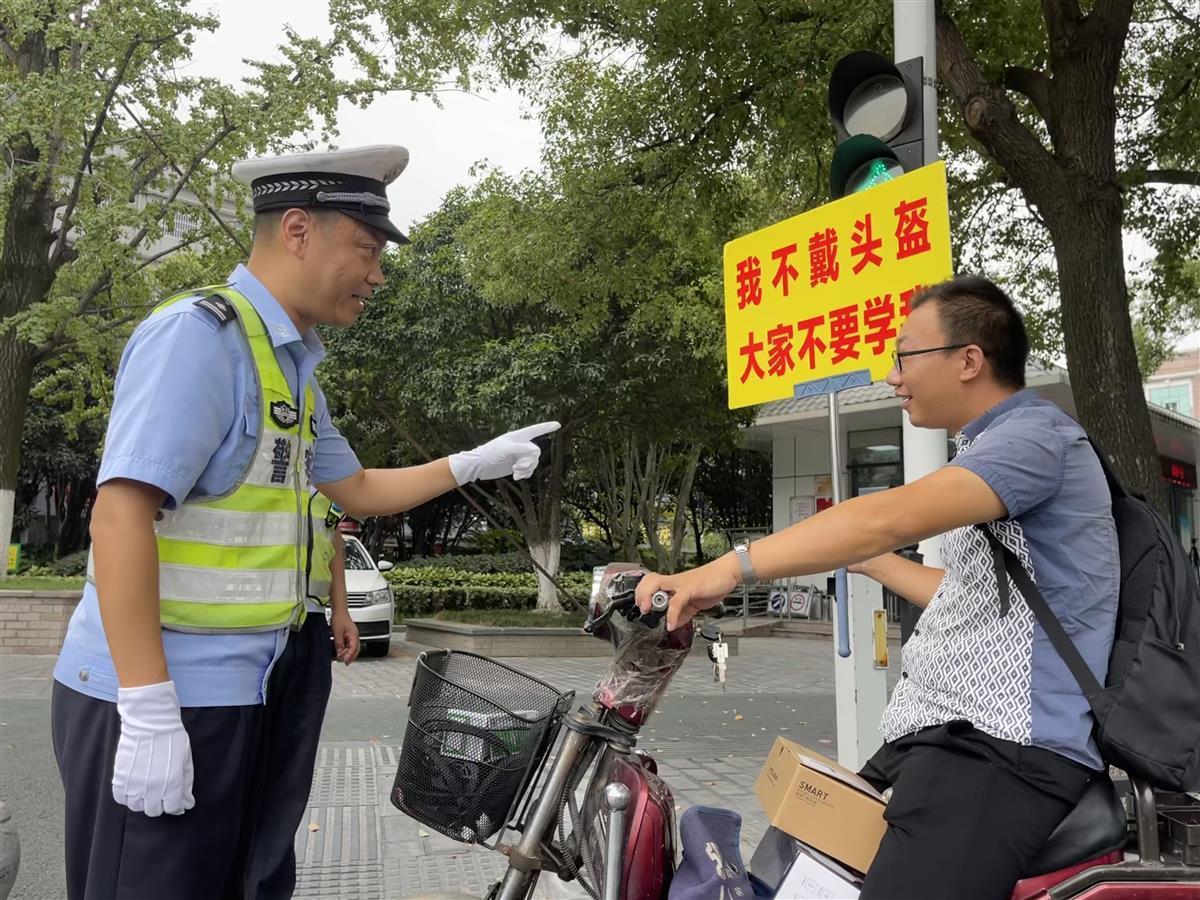 原来,这是襄城公安分局鼓楼警务平台为了进一步增强广大群众骑乘出行佩戴头盔的安全意识而出的“新招”。从8月21日起,这样一场场意趣盎然的交通文明劝导活动在襄城任意路口随机上演。