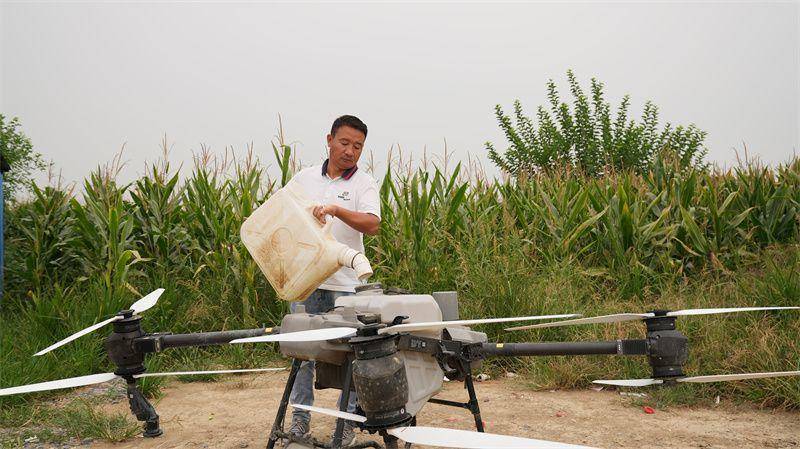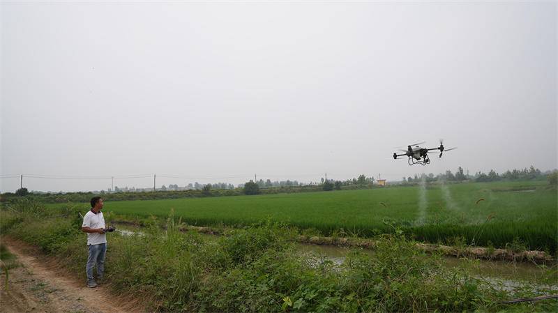 8月25日,在郑集镇潘河村种粮大户潘晓军的千亩稻田上空,一台无人机正在来回穿梭,喷洒农药开展飞防作业。农技专家主动上门帮他查看水稻长势和病虫害防治情况,叮嘱他一定要注意稻田用水、施肥和病虫害防治,确保水稻茁壮成长。