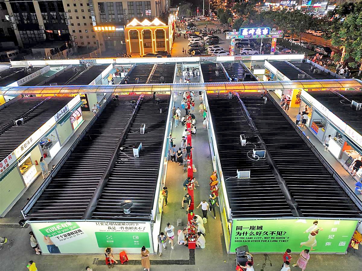 8月25日,武汉市江夏经开区大桥现代产业园金樱街,东湖学院、汉口学院附近的一块空地变身鑫岭夜市,正式开张迎客。夜幕降临,129家扎堆在大学校园周边的流动商贩,入驻夜市固定门店,烹、炸、蒸、煮、烤……浓浓的烟火气吸引着附近居民品尝美食。