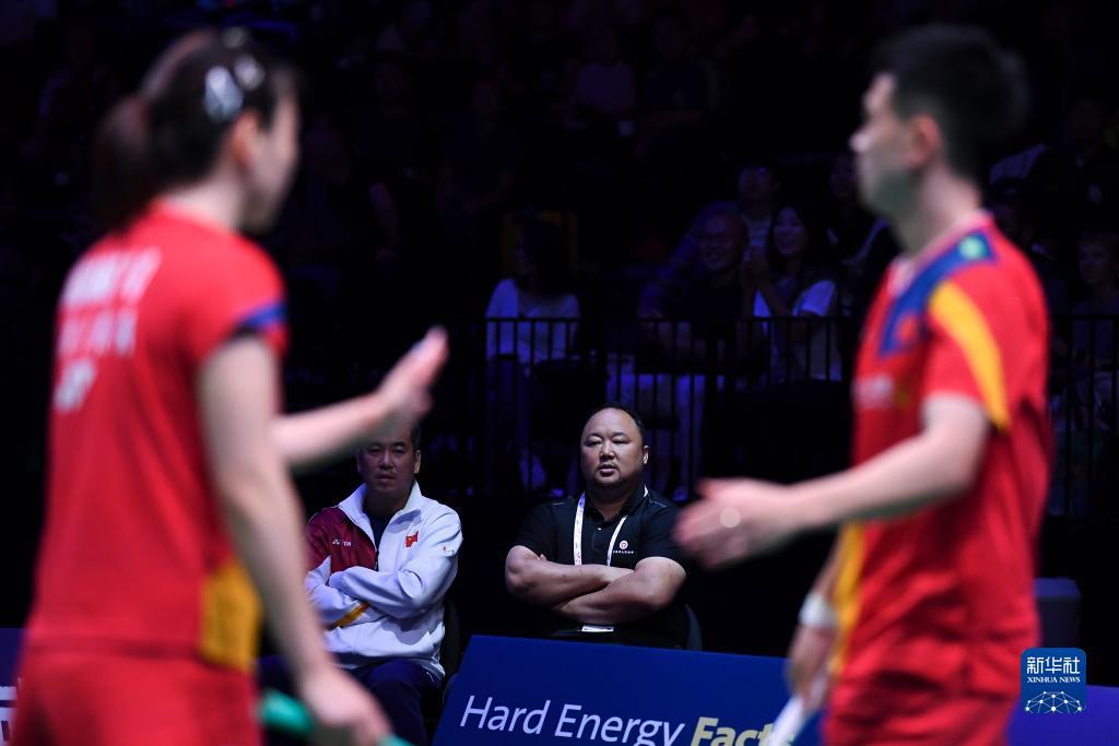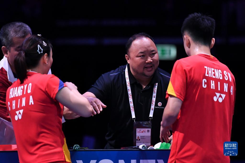 8月27日,中国羽毛球协会主席张军(右二)在场边指导郑思维(右一)/黄雅琼。新华社记者 任鹏飞 摄