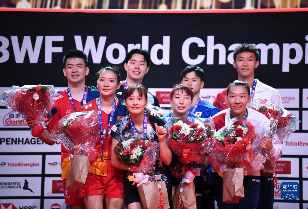 8月27日,亚军中国组合郑思维(后排左一)/黄雅琼(前排左一)、冠军韩国组合徐承宰(后排左二)/蔡侑玎(前排左二)、季军中国组合蒋振邦(后排右一)/魏雅欣(前排右一)和日本组合渡边勇大(后排右二)/东野有纱(前排右二)在颁奖仪式上。新华社记者 任鹏飞 摄