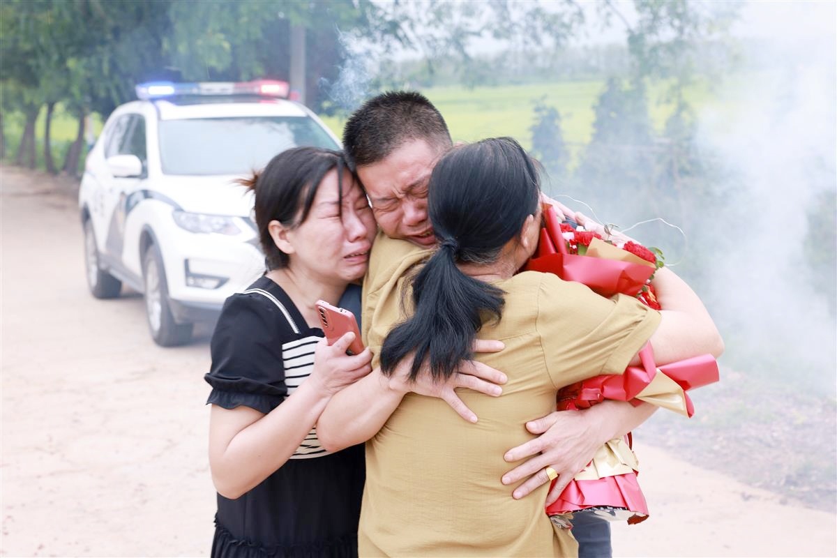 8月28日上午,在黄梅县濯港镇茶山咀村村口,宋婆婆和女儿、小儿子一早便等候在路旁,翘首以盼等着大儿子回家。上午11时18分,当车队驶进村口时,车子还没停稳,宋婆婆便冲上前,一眼认出了从车上下来的大儿子。她右手抱着一束鲜花,腾出左手一把将高出自己一个头的儿子搂进怀中。压抑了34年的感情就像脱闸的洪水得到了释放,宋婆婆禁不住失声痛哭,民警和旁边围观的村民见状,也忍不住偷偷抹泪。