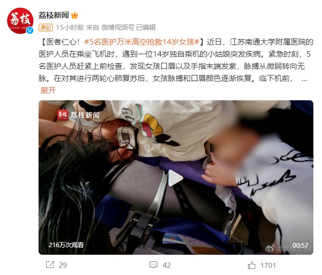 近日,江苏南通大学附属医院的医护人员在乘坐飞机时,遇到一位14岁独自乘机的小姑娘突发疾病。紧急时刻,5名医护人员赶紧上前检查,发现女孩口唇以及手指末端发紫,脉搏从微弱转向无脉。在对其进行两轮心肺复苏后,女孩脉搏和口唇颜色逐渐恢复。临下机前,女孩已经能做一些简单交流,医护人员在旁守护直到120急救人员登机。