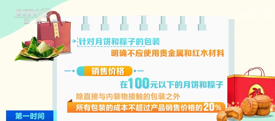 针对月饼和粽子的包装,明确不应使用贵金属和红木材料;销售价格在100元以下的月饼和粽子,除直接与内装物接触的包装之外,所有包装的成本不超过产品销售价格的20%;售价在100元以上的,包装成本不超过产品销售价格的15%。