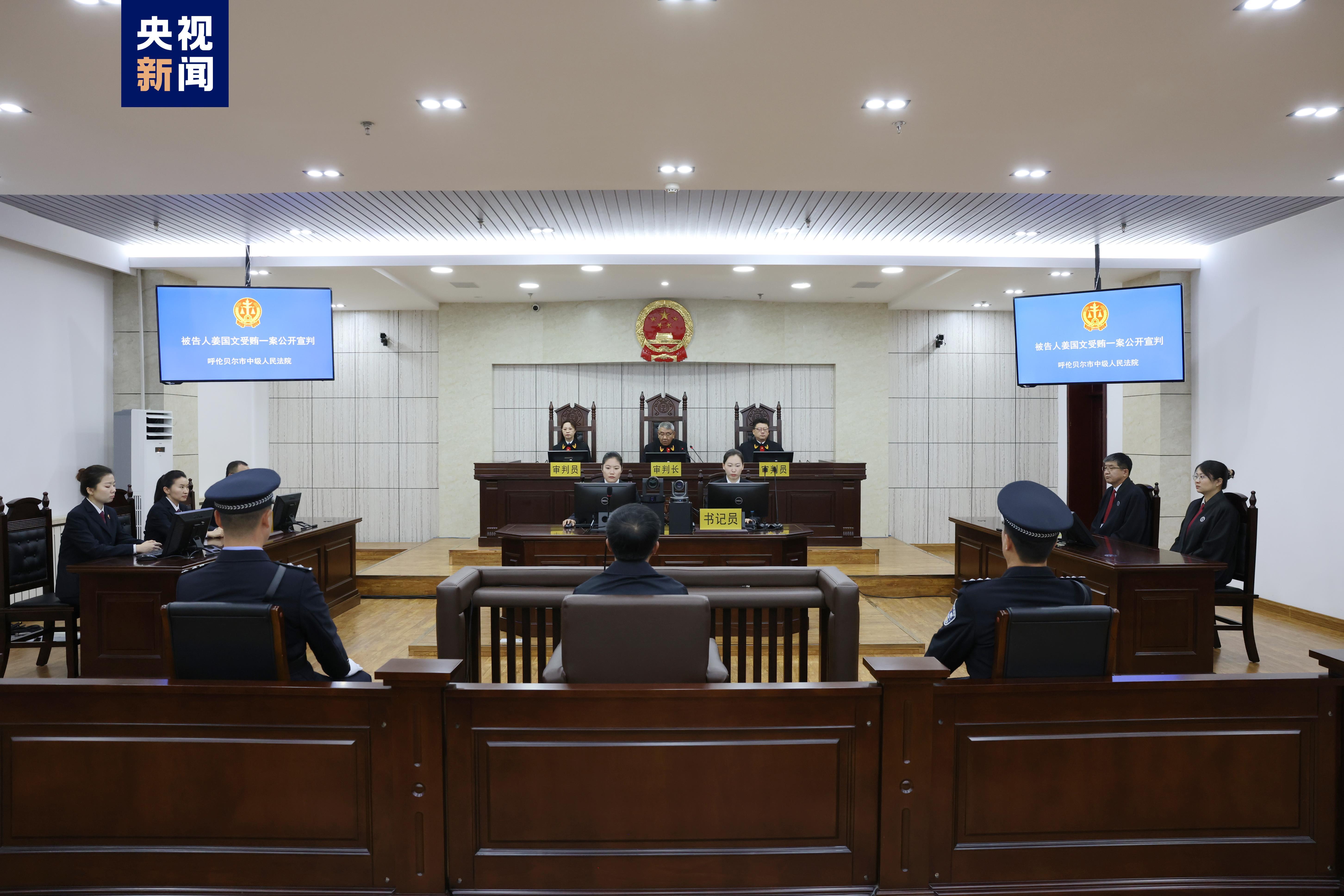 2023年8月29日上午,内蒙古自治区呼伦贝尔市中级人民法院公开宣判黑龙江省哈尔滨市政协原党组书记、主席姜国文受贿一案,以受贿罪判处被告人姜国文无期徒刑,剥夺政治权利终身,并处没收个人全部财产;对扣押、查封、冻结在案的姜国文受贿所得财物及其孳息予以追缴,上缴国库。
