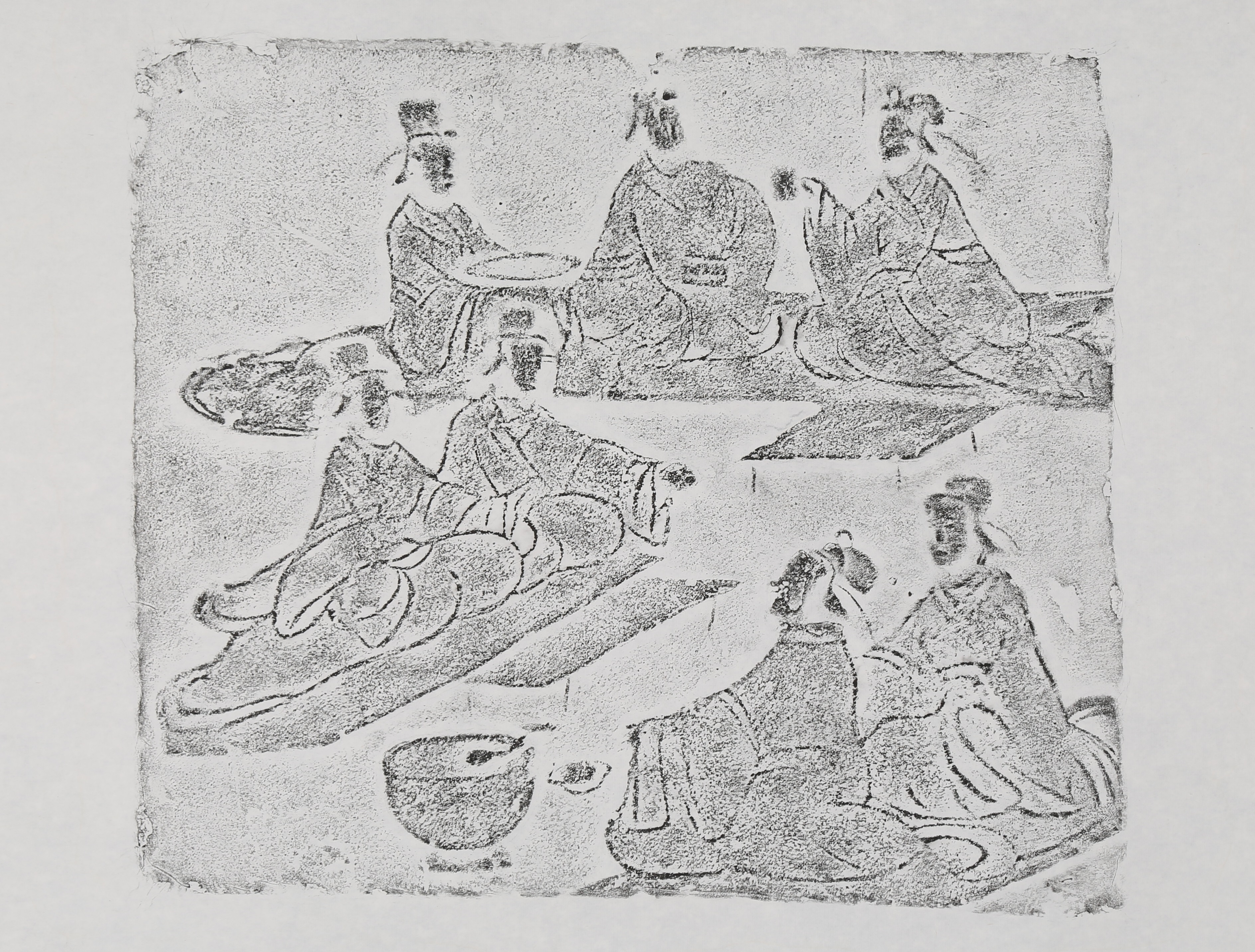 △宴饮画像砖,画面中的七个人坐于席上,座前各设有案几,用以盛放酒具、餐具。四川博物院藏