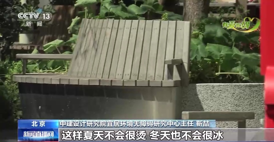 中建设计研究院宜居环境无障碍研究中心主任 靳喆:座椅材质用了木质的,这样夏天不会很烫,冬天也不会很冰。同时也给老年人设计了一个撑扶的扶手,便于他们起身的时候助起。