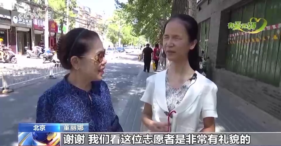 这位志愿者是非常有礼貌的。她首先触碰一下视障人士的胳膊,表示在跟她说话;其次她问“需要我的帮助吗?”大家要注意,千万不要直接拉着盲人朋友的盲杖往前走,或者直接说,“来,跟我走。”这都是不太合理也不太礼貌的。一般情况之下,视障朋友都会很愿意跟志愿者走一段路。