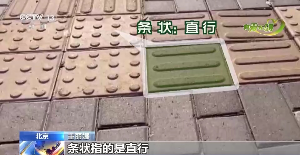 我们看到在人行道上会有这种黄色的(地)砖,这个其实不是一种装饰,这个是盲道,它上面会有条状或者是点状的(图案)。条状指的是直行,点状就是转弯或者停止这样一个标志。盲道是不是很安全呢?并不是。因为刚开始就会有(障碍物)一些(自行车)车在挡(盲道)路,这样的现象是挺常见的。所以希望大家不要把你们的车辆或者各种各样的东西放到盲道上。