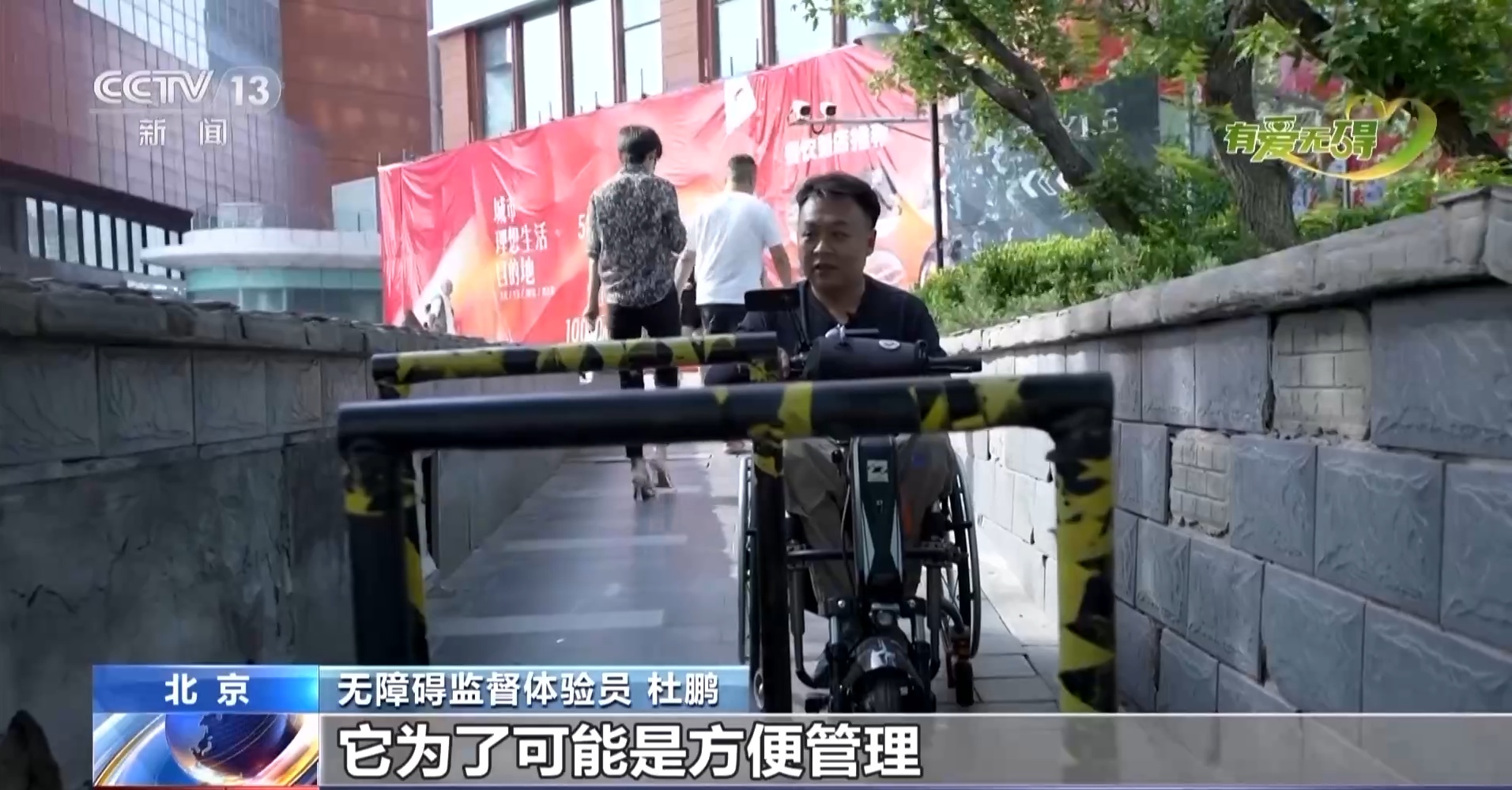无障碍监督体验员 杜鹏:朝阳大悦城也是我们经常来的一个商场,它的外围一共分两个无障碍坡道,这侧是西侧的一个无障碍坡道,整体来说非常好。东边进入这个坡道,可以看到,可能是为了方便管理,竖了两根杆,这样的话,我们不管是从什么方向来到大悦城,只能从西边坡道进入。