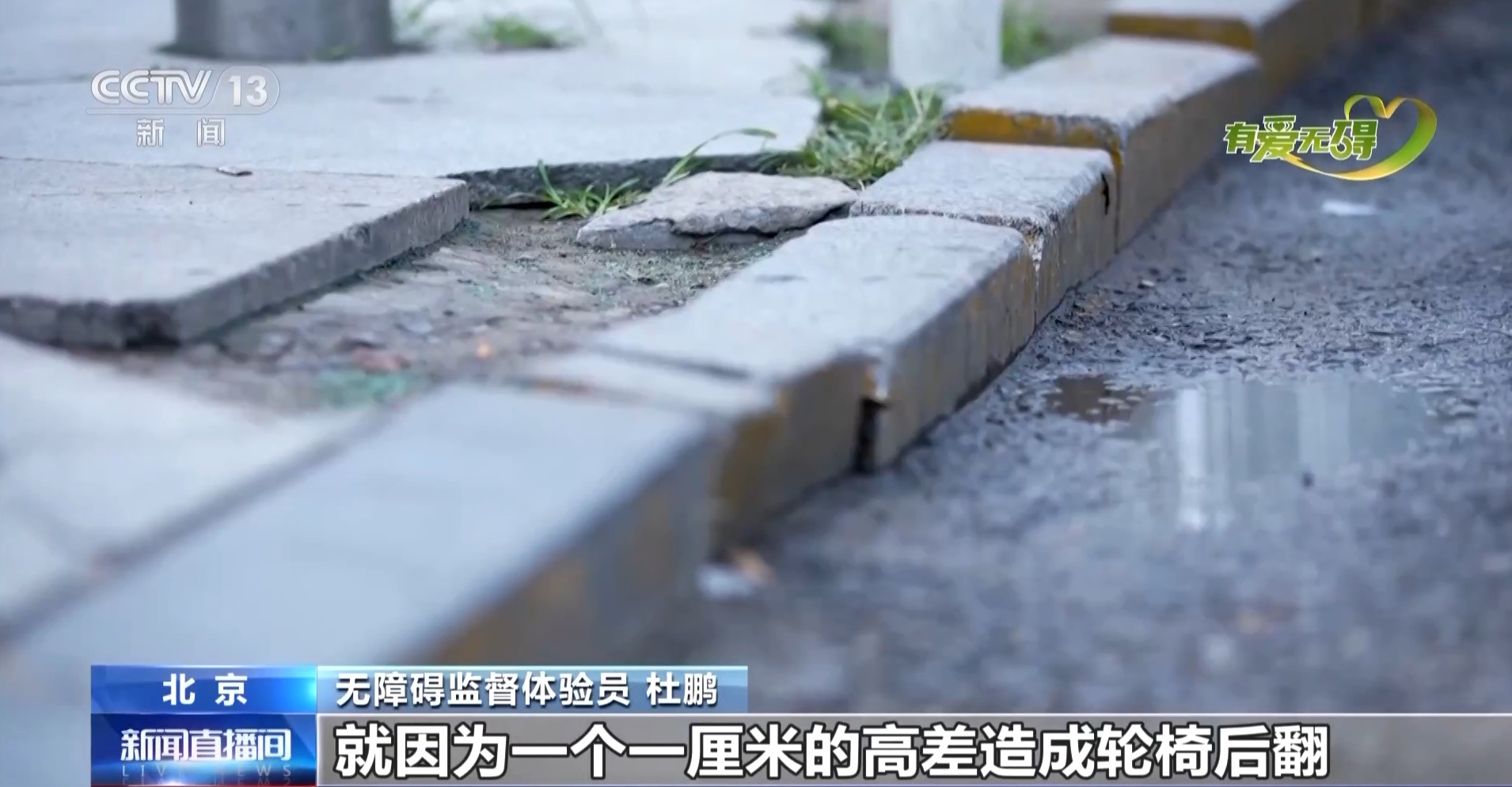 我们刚才从那边过来,缘石坡道就特别方便。顺着人行道过来以后,我要上到这个区域里,按理说这个位置应该设置缘石坡道,它没有设置,而且还有很大的高差,包括盲道的铺设也不对,还有破损。高差问题是我们轮椅使用者的一个生命线,现在都要求零高差。我们曾经有一个伤友因为一厘米的高差造成轮椅后翻,结果在ICU里躺了半年多才缓过来,捡回一条命,这个区域我现在肯定上不去了,我得绕很远的地方才能上到这个区域里。