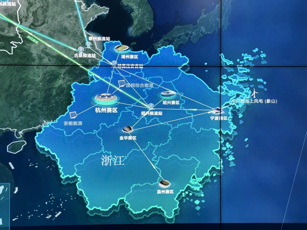 更有趣的是,大屏显示,青海柴达木盆地的光伏发电,新疆哈密、巴楚等地的风力发电,正通过交直流特高压网架“西电东送”,源源不断地输送至各个亚运场馆。