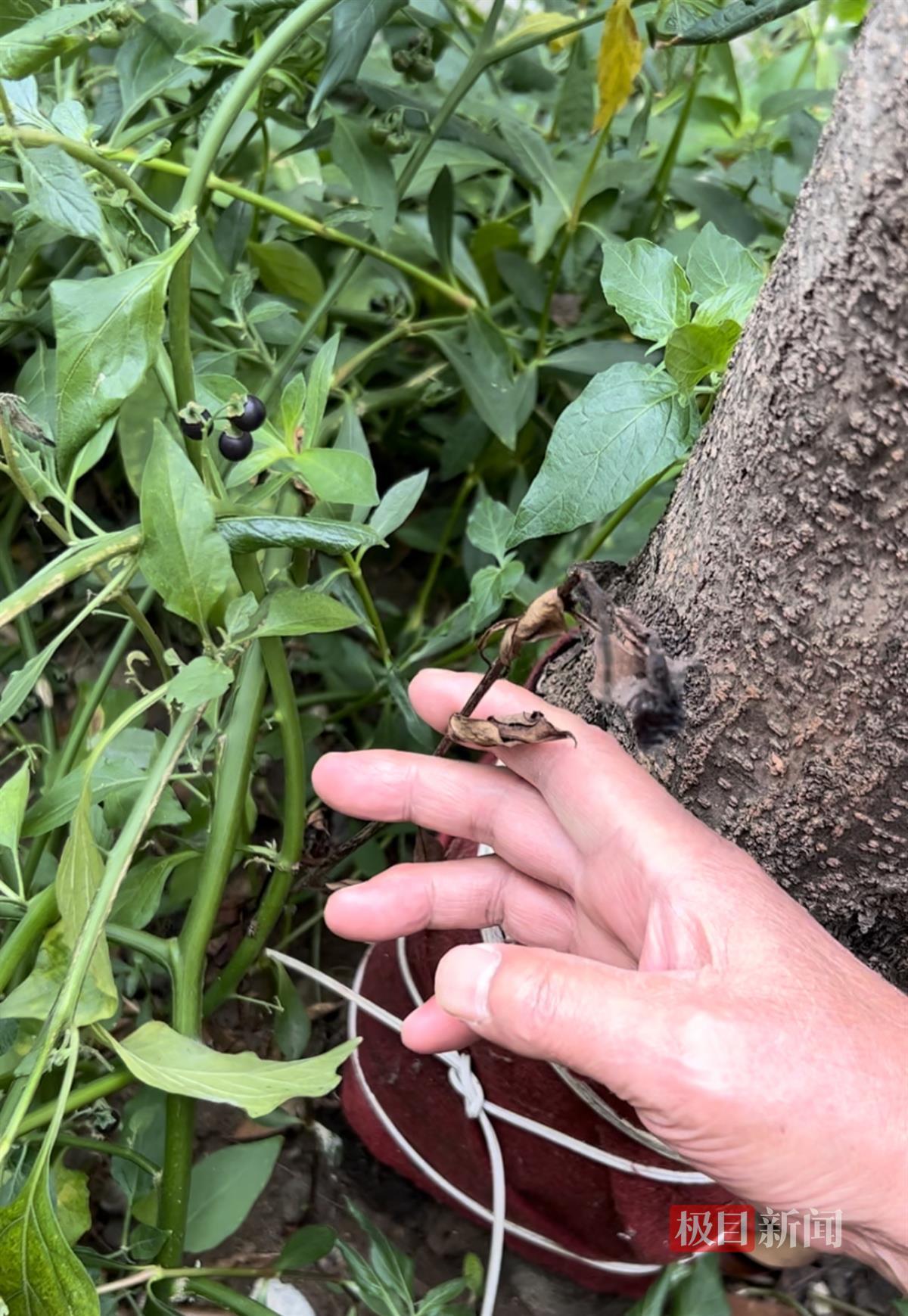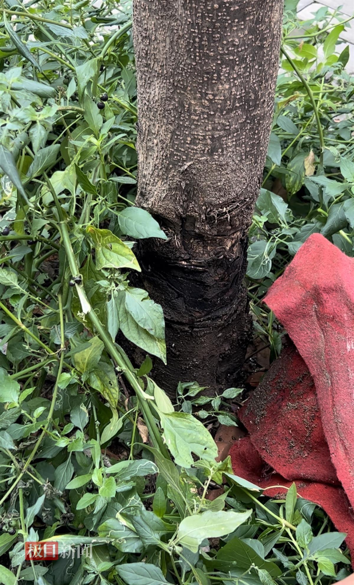 记者现场看到,这棵樟树高约10米,最高处达到了三层楼的高度,树叶全部已经呈现出枯黄色,不少树叶枯萎后慢慢掉落,和旁边两棵绿意盎然的树木形成鲜明对比。“樟树根部的小树苗都死了,所以我怀疑是有人故意泼硫酸导致的。”陈爹爹拨开根部的杂草,枯黄的树苗便裸露出来,而接近根部的树干处却被一块红布包裹着。陈爹爹介绍说:“去年不知道是谁在树的根部砍了很多刀,我听其他人说,用布包起来可以让它活下去。”陈爹爹揭开捆绑在红布上的绳子后,记者发现,这棵樟树的树干早已“伤痕累累”,树木根部布满了不少利器留下的砍痕,被红布包裹的地方爬满了蚂蚁和蛀虫。