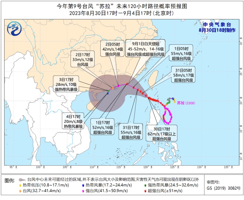 中央气象台8月30日18时继续发布台风橙色预警:预计“苏拉”将以每小时10-15公里的速度向西北方向移动,即将移入南海东北部海面,逐渐向广东东部到福建南部一带沿海靠近,有可能于9月1日白天在广东惠来到香港一带沿海登陆,也有可能在广东东部近岸海面向西偏南方向移动。