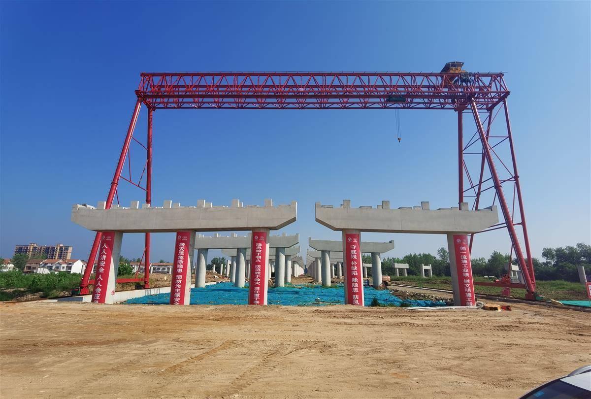 现场,密密麻麻的桥墩如同门字伫立在地上,线路雏形已经显现。正在施工的邾城互通A匝道为连接线右幅双向互通匝道,三跨共计架设15片箱梁。