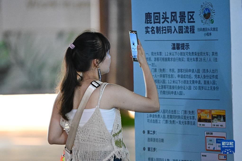 8月29日,游客在鹿回头风景区外扫码预约免费门票。