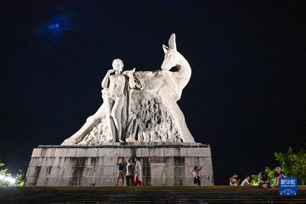8月29日,游客在鹿回头风景区标志性景点鹿回头雕像前游玩。