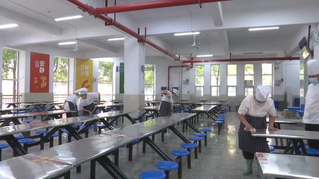 学校食堂内,工作人员正认真对每一个角落进行清洁和消杀,用干净整洁的环境迎接学生们的到来。