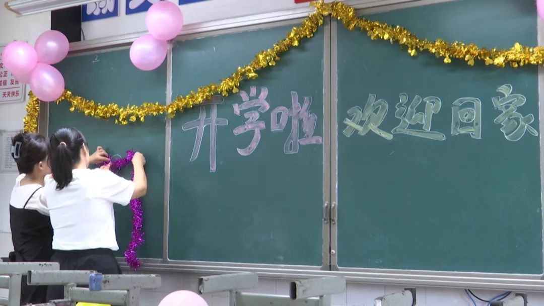 教室里,教师们正在黑板上书写欢迎语,并挂上气球、彩带装点四周,为新生营造舒适温馨的校园环境。