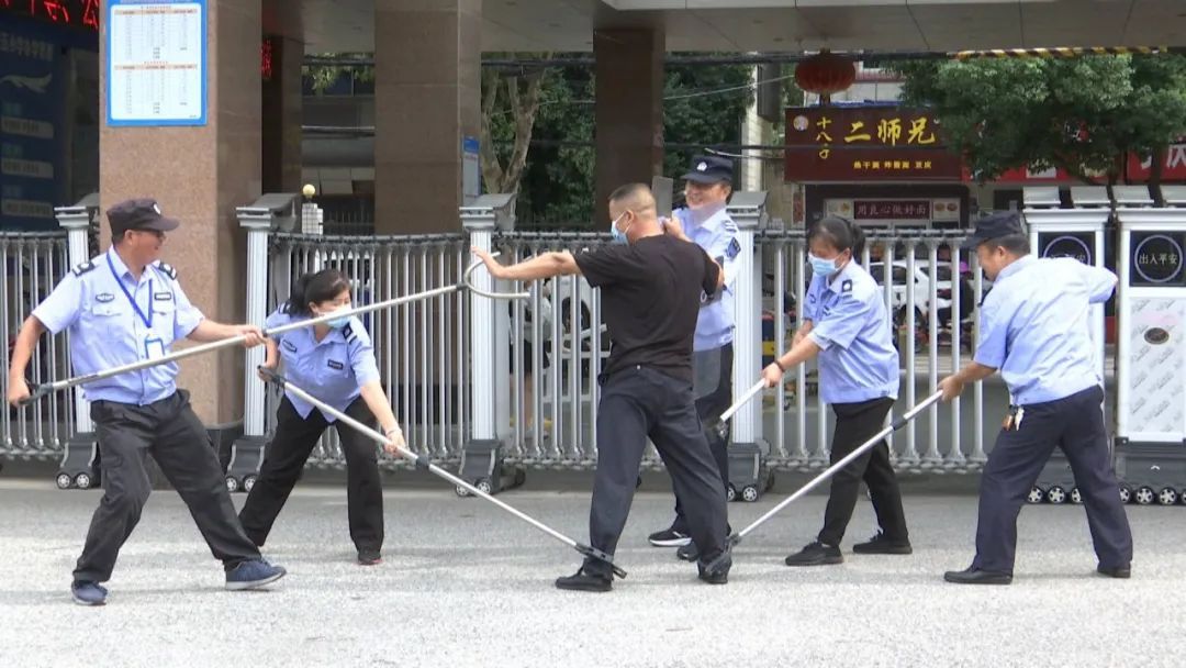 在前川五小,保安队员们正在进行防暴训练,模拟突发事件,做好演习,为安全开学保驾护航。