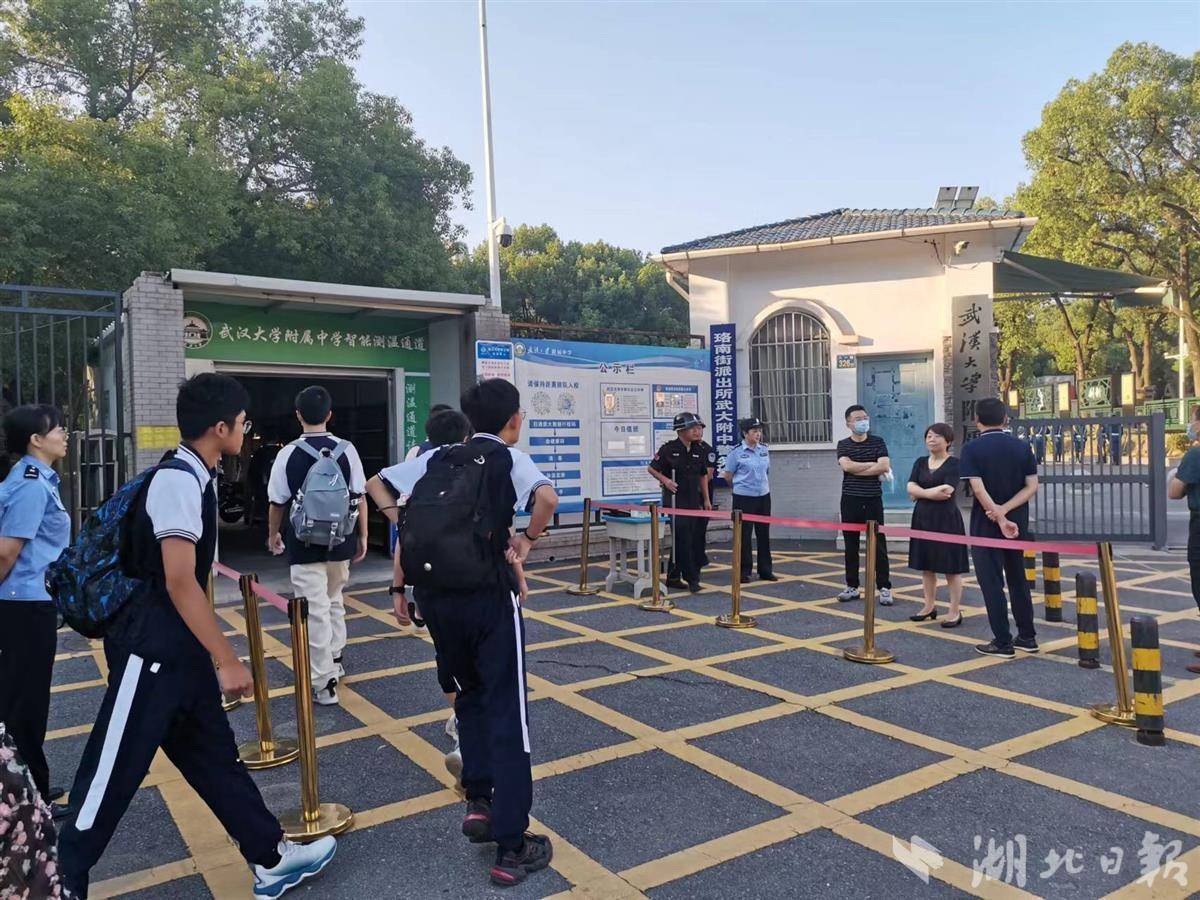 当日早上7点,武汉大学附属中学校门口,在多部门值守下,同学们有序通过测温通道,进入校园。校园进行了整修,给人焕然一新的感觉。根据要求,开学第一天,除了学校领导,辖区教育、公安等相关部门也必须到岗到位值守,确保开学安全。