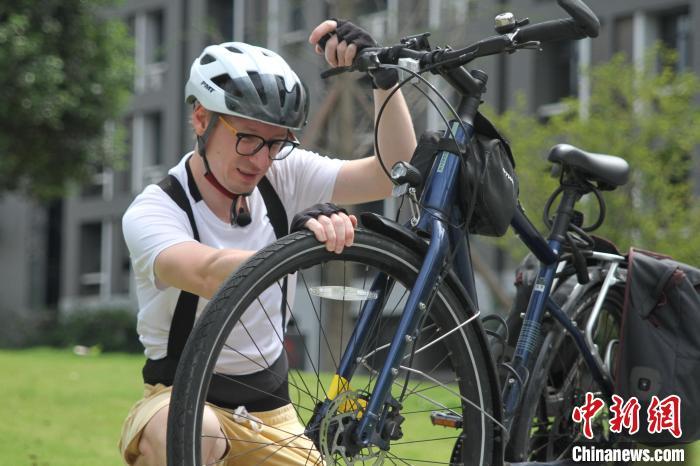 8月30日,在四川大学校园内,法籍教师吉米检查自行车状况。中新社记者 王利文 摄