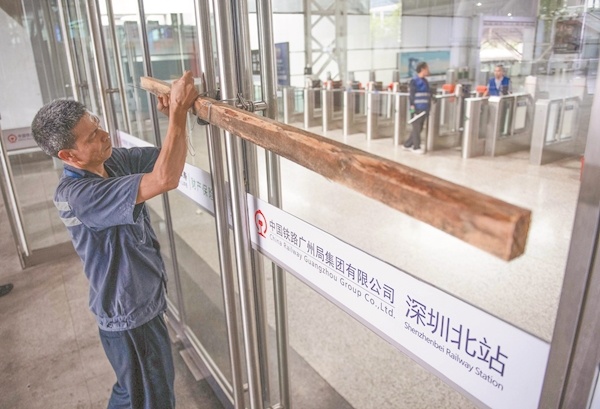 9月1日,深圳北站工作人员加固玻璃门 新华社发
