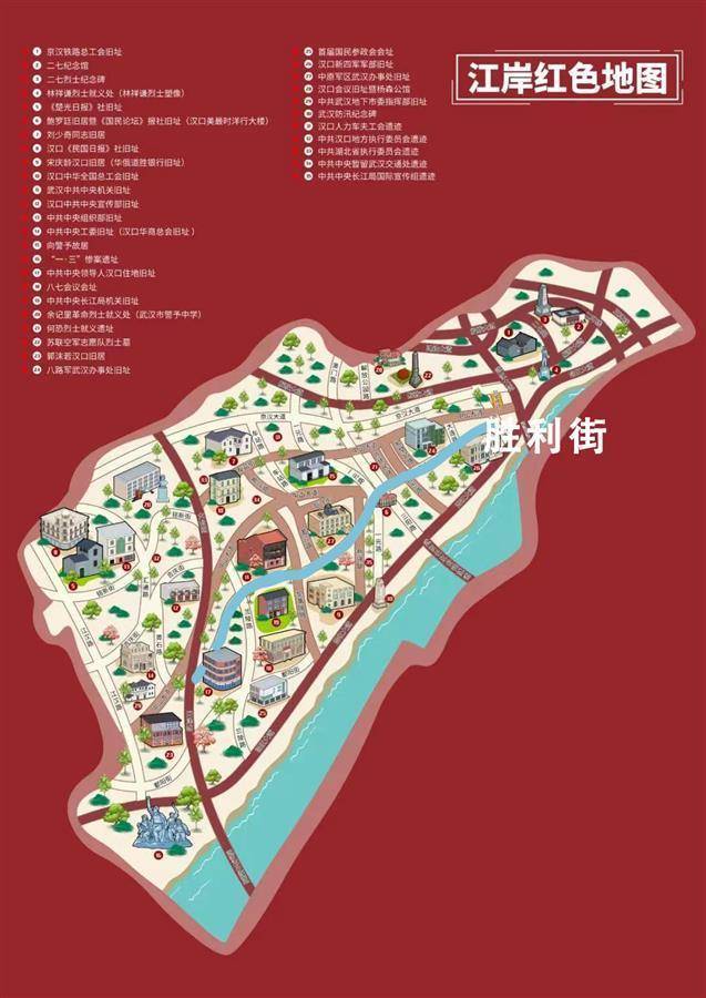 胜利街位于武汉市江岸区,起于江汉路,止于卢沟桥路,总长3.8公里。在清政府时期,它是有着玛琳街、德托美领事街等名字,分属英、俄、法、德、日、比等各国租界的数条街道。在收回汉口全部租界后,为纪念抗战胜利,这条被五国租界切割成6段的街道被重新合并命名为胜利街。在其周边,坐落着八七会议旧址、八路军武汉办事处旧址纪念馆、詹天佑故居、新四军军部旧址纪念馆、中共中央长江局旧址、向警予故居等红色景点。