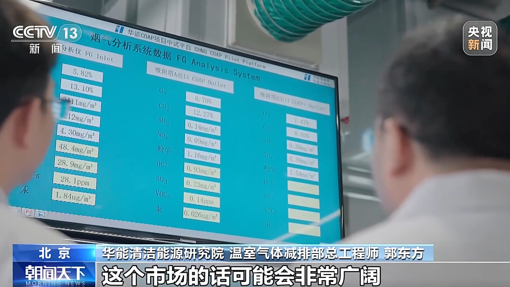 华能清洁能源研究院 温室气体减排部总工程师 郭东方:通过验证,我们目前的新技术可以使二氧化碳的捕集成本降低40%以上。现在市面上的二氧化碳的销售价格一般是在每吨550元左右,所以如果成本的话做到每吨200元以下,这个市场可能会非常广阔。