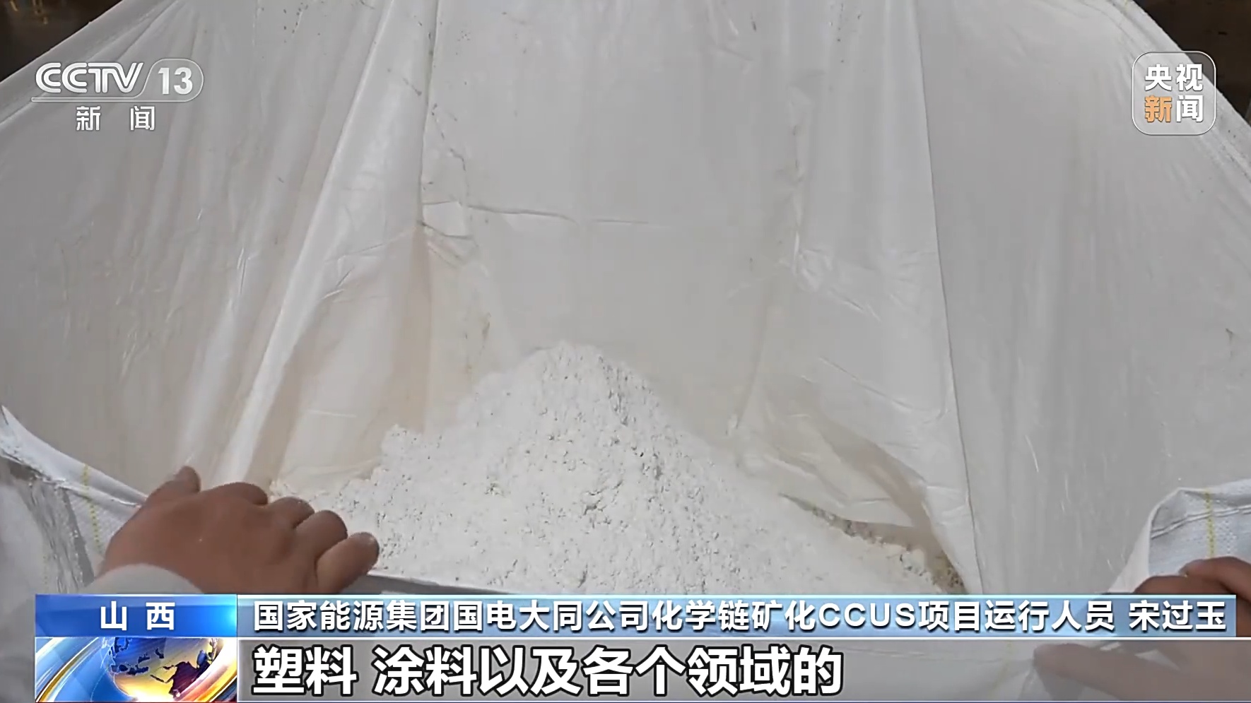 国家能源集团国电大同公司化学链矿化CCUS项目运行人员 宋过玉:产品主要用在建材、橡胶、塑料、涂料等领域,利用非常广阔。这是我们用电厂中烟气中的二氧化碳与工业固废电石渣反应生产出来的产品,目前日产量在8吨左右。