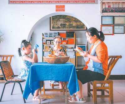 刘寿仙及女儿、外孙女正在做绣活。湖北省黄冈市红安县委宣传部供图