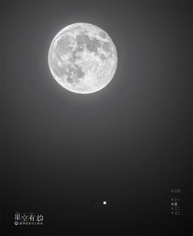 修立鹏提醒,除了用肉眼观赏这幕“星月对话”外,有兴趣的公众如果使用长焦镜头或是小型天文望远镜观看,不仅可以拍到月亮与木星“同框”的画面,还可以拍到木星两侧的四颗伽利略卫星。