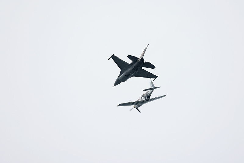 当地时间9月2日,2023年加拿大国际航展在多伦多举行。美国空军一架F-16战机(上)与飞行爱好者驾驶的P-51“野马”老式战机在航展上组队进行飞行表演。