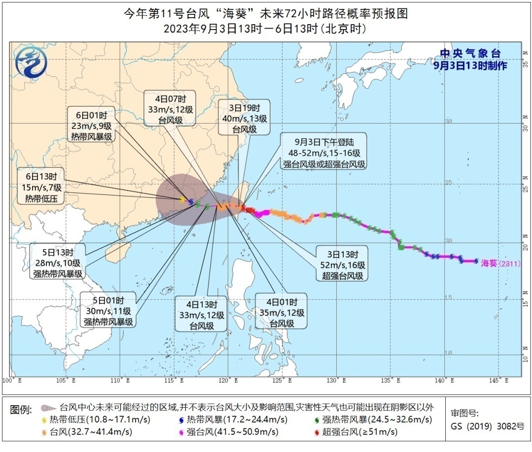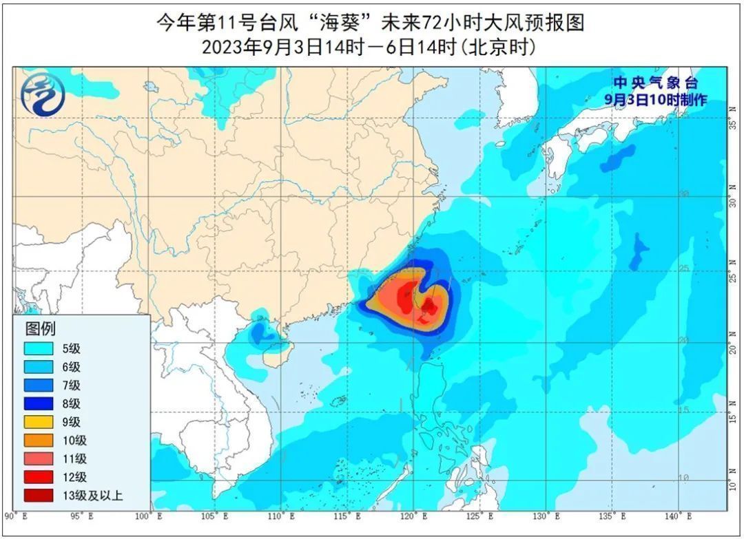 预计9月3-6日,巴士海峡、台湾海峡、台湾以东洋面、东海南部及钓鱼岛附近海域、南海东北部偏北海域及台湾岛沿海、浙江南部沿海、福建沿海、广东东部沿海将有6~8级、阵风9~10级大风,部分海域或地区的风力有9~12级,阵风13~14级,“海葵”中心经过的附近海面或地区的风力有13~16级,阵风17级。
