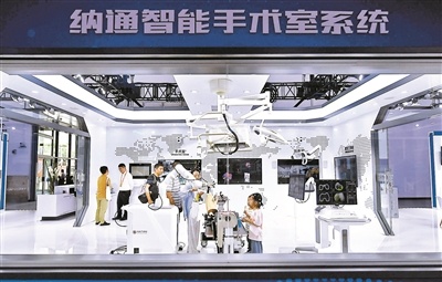 纳通集团展台搭建了一间智能手术室,演示由机器人“主刀”的关节置换手术